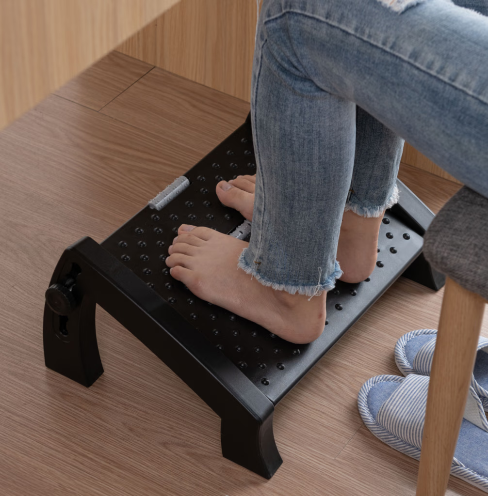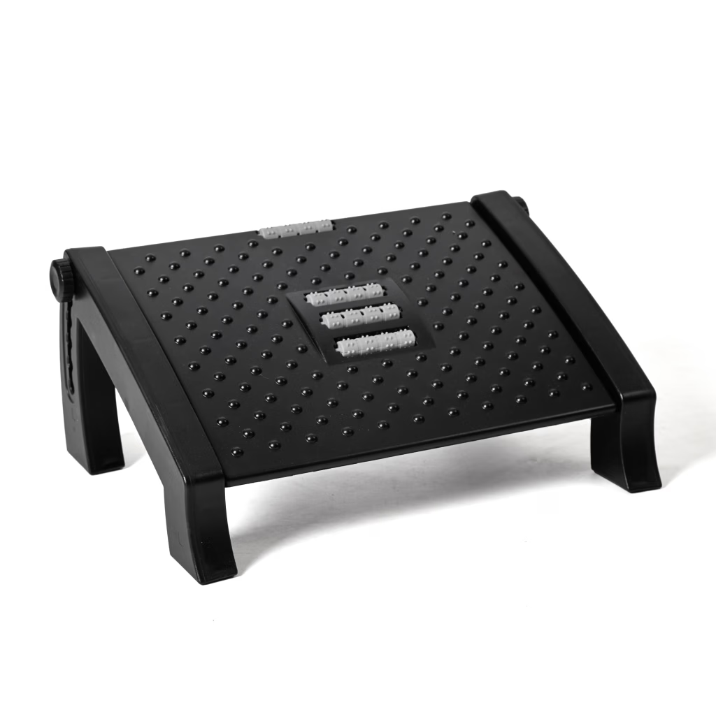Reposapiés ergonómico de primera calidad para colocar debajo del escritorio y lograr una postura adecuada. Ayuda a reducir la presión en la espalda, el cuello y las piernas, mejorando la comodidad durante largas horas de trabajo.