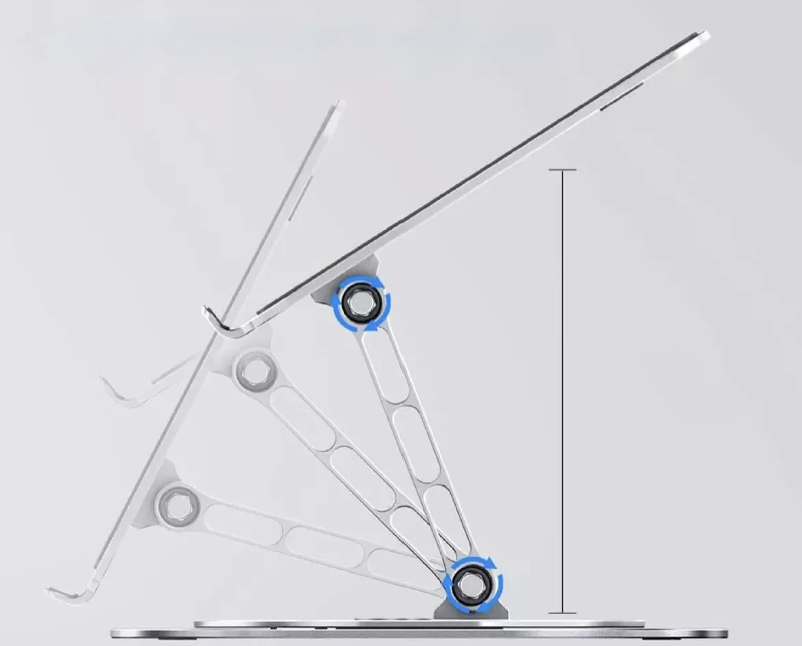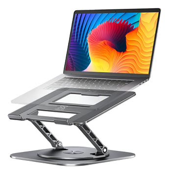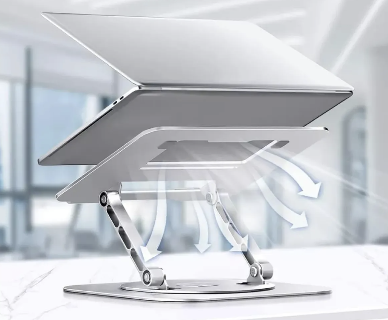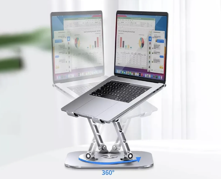Este soporte de acero con rotación 360° está diseñado para mejorar tu postura, facilitar el trabajo colaborativo y optimizar la ventilación de tu laptop. Es ideal para escritorios de oficina o espacios de home office que buscan funcionalidad y diseño en un solo producto.